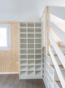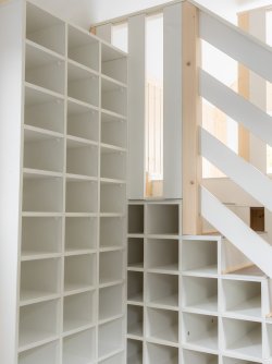 Perfectly customized and thought through down to the smallest detail, colorful built-in cupboards and shelf systems provide a lot of storage space.