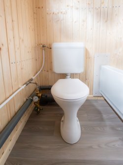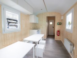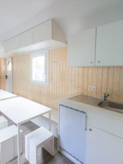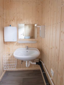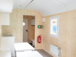 The small kitchen is equipped with a stainless steel sink and an electric cooker so you can prepare warm meals. In the toilet compartment, there is a camping toilet as well as a washbasin with fresh water and waste water tanks. The diaper-changing table can be folded onto the wall to save space.
