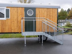 Fitting perfectly into the planned environment with a green body and brown window shutters. To ensure stability, there are four continuously adjustable screw spindle supports mounted on the chassis.There is a roof overhang located above the door as protection against the weather, and the entry stairway is equipped with a railing for safety.