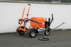 Barrel spraying machine trailer version for processing asphalt emulsions and adhesives directly out of the barrel with diesel-hydraulically driven binder pump.